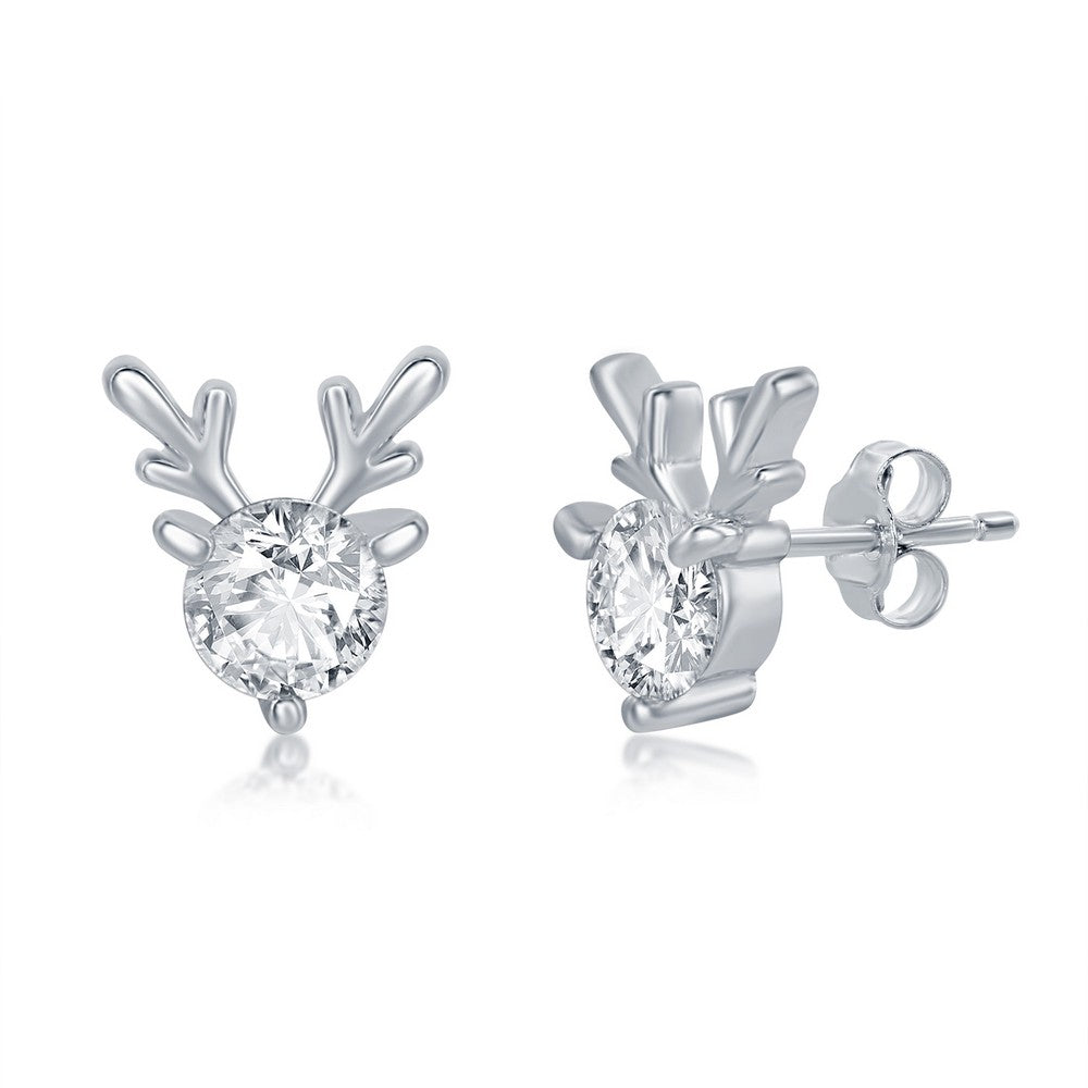 Sterling Silver Round CZ with Deer Antlers Earrings